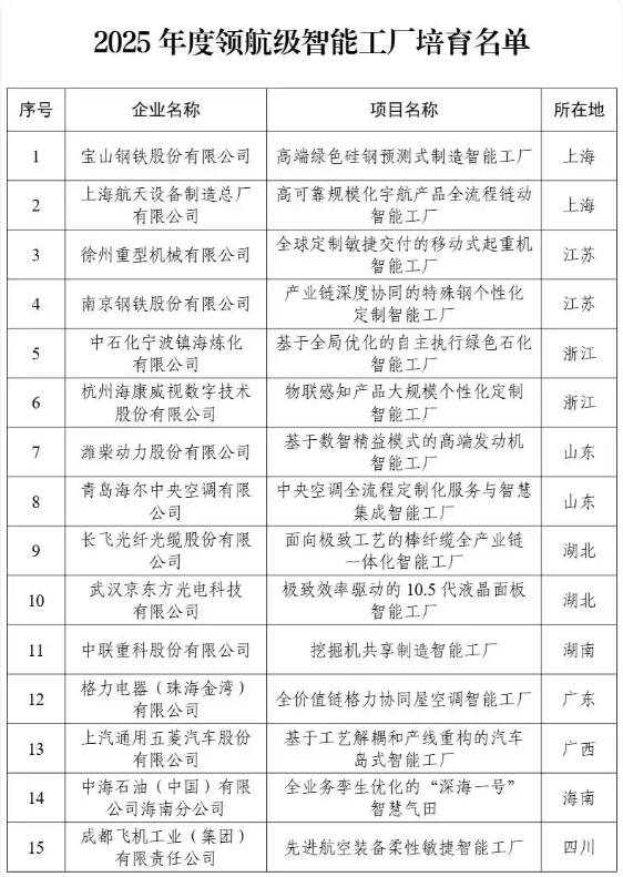 文/冯玲玲 工信部等六部门于11月27日正式公布首批15家试点级智能工厂,涵盖装备制造、原材料、电子信息、消费品等多个重点行业。什么是智能中试级工厂?工信部相关负责人介绍,试点级智能工厂融合了新一代信息技术、先进制造技术、理念以及精益管理等,代表了我国智能制造的最高标准。随着FI的发布首批15家试点级工厂,我国智能制造体系实现了关键跨越。在数字化、网络化的基础上,我们将进一步迈向以人工智能深度应用为特征的智能化新阶段。资料来源:工信部官网打造智能工厂“金字塔”。此次试点级智能工厂的设计和建设源于今年6月工信部等六部门联合启动的梯度培育工厂智慧行动。根据《智能工厂梯度培育要素条件(2025年版)》,行动NA将智能工厂分为基础级、先进级、效率级和试点级四个等级。中国电子信息产业发展研究院新型工业化研究院研究室主任王苏h研究院在接受采访时表示,这四个层次分别对应了公司发展路径的不同阶段。这种层层设计各有侧重、目标明确,为公司智能化转型指明了明确的方向。具体来说:基础层面主要针对初创企业,引导其完成从“有设备”到“用数据”的基础转型。该层级鼓励企业自我评估、自我建设,降低门槛,旨在提高智能化的渗透率,让更多企业迈出智能化转型的第一步。先进水平要求企业实现系统合作,并在行业内有一定影响力。这一级别得到了当地政府和集团商业组织的认可,强调了区域示范作用。这种卓越水平要求企业具备智能优化能力成为全国性的示威带头人。试点级别作为最高级别,重点探索未来制造模式,强调“全球领先”的目标和人工智能的深度应用。无论是熟练级别还是中试级别,均通过专家评审、现场考察等严格机制选拔,确保高品质和行业领先。最高标准引领了行业新方向。 《智能工厂梯度培育要素条件(2025年版)》对试点工厂设定了严格的“准入门槛”,要求试点工厂在建设成果上关键技术经济指标全球领先。其中,人工智能技术应用场景占比至少为60%,高于效率要求的20%。从建设内容来看,试点应涵盖工厂建设、研发生产等五个方面。设计、生产运营、生产管理、运营管理。从技术融合的角度来看,中试级工厂需要实现人工智能与制造的深度耦合,工业互联网+数字孪生+计算基础设施的集成应用,以及从产品生命周期到整个供应链各个环节的协同。技术融合的深度决定了中试级工厂的首要竞争力。以此次入选的南港为例。它利用数字孪生和人工智能来支持特殊钢的定制生产。订单准时完成率达到98.5%,新品开发周期较传统模式缩短50%。徐工通过人为驱动的研发和制造模式,增强全球定制能力,订单到订单周期缩短55%。除了技术上的突破,试点工厂还实现了管理和商业模式的创新。这些工厂通常建立了运营管理智能,导致营销、产品服务和供应链管理等核心流程变得不那么人性化和绝望。制造过程可以实现零浪费、零库存、零排放,形成低碳、分布式、净零制造的可持续模式。同时,试点级工厂也回归使命,通过“母厂+复制工厂”机制引领产业链上下游合作。王苏表示,试点工厂主要集中在高端装备、基础零部件、新一代信息技术等战略性产业。它们不仅是我国技术领先的体现,也是提升中国制造水平的关键平台我们在全球价值链中。它们可以帮助中国制造业打造全球标杆,成为创新扩散中心,支持高端产业自主可控,引导资本和政策着力点。首批推动更多企业智能化的试点级工厂的诞生,背后是我国智能工厂建设取得惊人成果的背后。官方数据显示,“十四五”以来,我国已建成初级3.5万多个、高级7000多个、230多个级别的智能工厂,形成了智能转型的坚实基础。以高效工厂为例,数百家工厂改造升级后,产品开发周期平均缩短28.4%,生产效率平均提高22.3%,不良品率平均下降50.2%,碳排放平均减少20.4%。智慧转型的价值得到充分证明。然而,如何鼓励更多企业迈向智能工厂仍是亟待解决的问题。值得一提的是,智能工厂并不是大企业的专属话题。据统计,我国50万家定点生产企业中,除以上企业外,中小企业占大多数,其中又以私营企业为主。他们是我国制造业转型升级的重要力量。但对于这些企业来说,智能工厂建设仍面临资金、技术、人才等方面的挑战。中国电子信息产业发展研究院产业政策研究所助理研究员李木斋认为,政府引导、供电、一把手、梯度培育是推动企业发展的关键。迈向智能工厂。具体来说,政府应发挥引导作用,通过政策支持帮助企业明确智能升级的方向和路径。同时,要加强智能制造装备、工业软件、系统等的开发和运用,加快培育制造系统解决方案提供商。龙头企业要发挥引领作用,形成大中小企业协同的产业生态系统。业务本身也是必要的。一步一步地,基于业务的发展需求,我们通过逐步改变和升级制造环节和流程来积累经验,逐步向更高水平的智能工厂迈进。