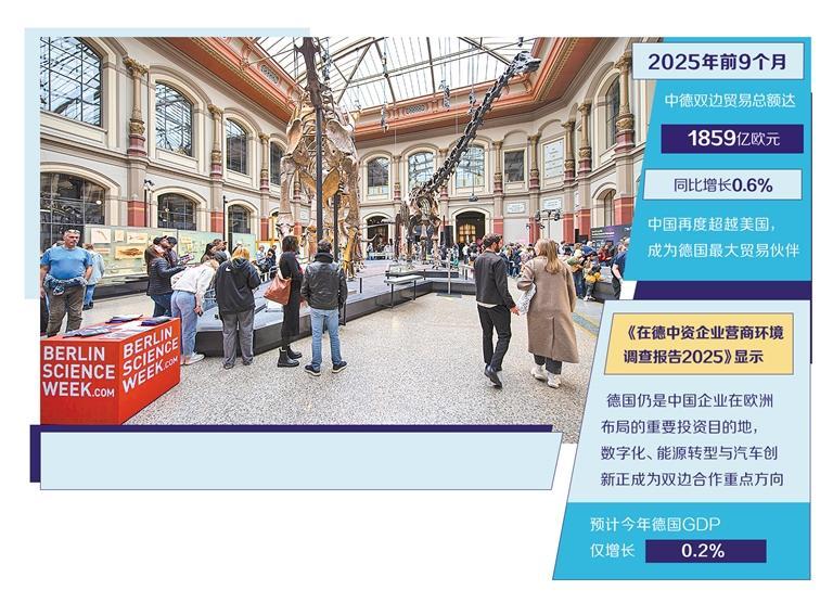 图为人们参观德国柏林自然历史博物馆(11月1日)。新华社记者 张浩夫 摄 近日,德国副总理兼财政部长克林拜尔率团访华。这不仅是德国新政府上台后首次高调访华,也标志着中德经贸关系翻开了新篇章。访华期间,克林拜尔与中方高级官员进行了深入交流,并共同主持了第四次中德高层财经会议。作为世界两大经济体,中德经贸合作不断深化不仅关系到两国自身发展,也将为世界经济复苏注入强劲动力。此次对话也证明,在“去风险论”盛行之际,经贸关系互利共赢的本质从未改变,其全球重要性日益凸显。回顾中德关系历史,经贸合作始终是两国关系的“压舱石”。自1972年建交以来,中德双边贸易额已从几百万美元跃升至当今世界最大的双边贸易额之一。 2025年前9个月,中德双边贸易总额达1859亿欧元,同比增长0.6%。中国再次超越美国,成为德国最大贸易伙伴。在上下文中全球贸易碎片化,体现了中德合作的稳定性和深度。德国中国商会与毕马威会计师事务所近日发布的《2025年中资企业在德营商环境调查报告》显示,尽管面临劳动力成本上涨等诸多挑战,德国仍然是中资企业在欧洲的重要投资目的地。通过优化营商环境,预计德国将吸引更多中国投资,进一步拓展合作空间。数字化、能源转型、汽车创新正成为双方合作的主要方向。毕马威德国国际业务主管合伙人格伦茨认为,德国以工程技术和工业基础着称,而中国企业则以研发和技术发展速度着称。两国优势的结合无疑将开辟广阔的发展空间企业空间。克林拜尔此次访华正值经贸合作面临诸多挑战之际。 2024年起,欧盟对华贸易壁垒将增加,导致德国对华出口增速放缓,企业“危险”的呼声逐渐增多。克林拜尔访华前声称,此行旨在加强与中国的商业关系,避免贸易紧张以及德国企业对所谓“中国产能过剩”等问题的担忧。在华期间,他还多次强调德中要加强供应链合作。此次对话为两国政府磋商宏观经济形势和多边合作提供了契机。根据会后发表的联合声明,中德双方在本次对话中达成27项共识,包括加强宏观经济政策协调、共同完善国际经济治理 对话中,中德双方强调,双方致力于通过双边渠道加强宏观经济政策协调,共同促进世界经济复苏和可持续发展,促进全球金融稳定。双方同意加强金融领域合作,在公平竞争的基础上扩大双向市场开放。双方致力于共同完善国际经济治理,支持以世界贸易组织为主要规则基础的公平、开放、透明、包容、公平、可持续、非歧视的多边贸易体制。此次对话向国际社会展现了中德进一步加强合作、共同努力维护经济稳定、推进金融管理改革的共识。从当前国际政治经济形势来看形势下,这无疑是一个务实而明智的选择。首先,经贸合作是两国经济复苏的“稳定器”。当前,德国经济面临“停滞陷阱”。德国经济专家委员会在最新年度报告中指出,德国经济仍处于疲软状态,预计今年德国国内生产总值(GDP)仅增长0.2%。作为世界制造业中心和最大的新兴市场,中国超过14亿人口和超过4亿中等收入群体的潜在消费为德国高端产品提供了充足的空间,反之,德国的精密工程和技术创新将有助于中国实现“双碳”目标。例如,中国提出深化金融对话,旨在通过人民币跨境结算和发行绿色债券来降低企业融资成本。这不仅会刺激德国中小企业来华投资的同时,也将欧洲资金注入共建“一带一路”项目。其次,经贸合作是全球供应链安全的“守护者”。后疫情时代,地缘政治冲突频发,全球供应链面临重组风险。作为出口导向型经济体,德国对中国的依赖度逐年突飞猛进,高于欧盟平均水平。克林拜尔在上海考察德国企业时表示,中国是“不可或缺的合作伙伴”。通过此访,中德双方一致同意加强加强经贸关系,这将有助于构建国内国际双循环和欧盟单一市场互补机制,避免供应链中断。试想,如果中德合作受到干扰,德国汽车业将损失数百亿欧元或德斯,中国的高端制造也将面临一些技术瓶颈。相反,中德合作的深化,有利于共同“把蛋糕做大”,体现供应链相关国家的利益。最后,庞经贸合作走出了人类命运共同体的实践之路。面对气候变化等全球性挑战,两国优势互补尤为重要。中国是世界上最大的可再生能源生产国,德国是风能和光伏技术的领先者。在第四次中德高层财金对话联合声明中,双方支持中德金融机构在环境债券环境信息标准互认方面加强交流,鼓励中德保险公司等金融机构开展气候风险联合研究和产品创新。这不仅是经贸合作的延伸,也是对全球公共产品的贡献。 (柏林日报通讯员 陈希孟)